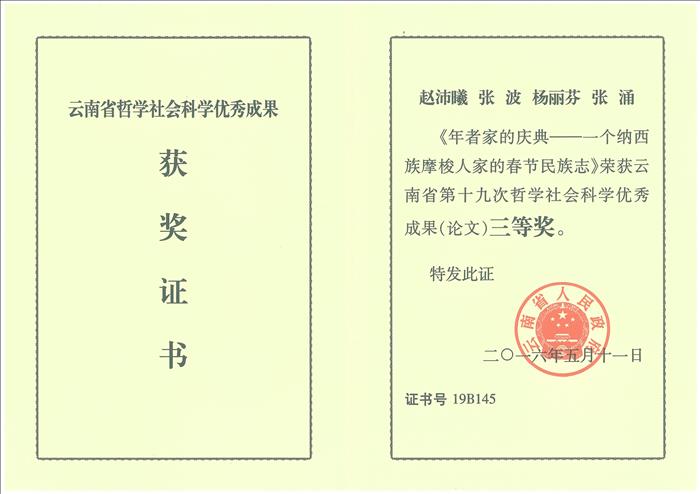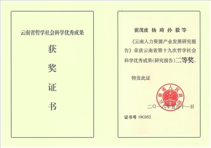 5月21日,云南省人民政府第十九次(2016年)哲学社会科学优秀成果奖励正式揭晓,我校杨琦博士作为第二作者的研究报告《云南人力资源产业发展研究报告》荣获优秀成果(研究报告)二等奖;赵沛曦教授的论文《年者家的庆典——一个纳西族摩梭人家的春节民族志》荣获优秀成果(论文)三等奖。