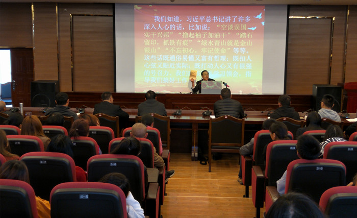左安嵩教授从“中国共产党的初心和使命”、“中国共产党践行‘不忘初心,牢记使命’的历史回顾”、“我们今天所处的时代特征”、“不辱使命、努力推进实现中华民族伟大复兴 ”四方面全面深入地讲解了“不忘初心,牢记使命,努力实现中华民族伟大复兴”的内涵。同时解读了习近平新时代中国特色社会主义思想的重要内容,要求大家要读原著、学原文、悟原理,深入学习领会习近平新时代中国特色社会主义思想,紧密团结在以习近平同志为核心的党中央周围,不忘初心,牢记使命,为努力推进实现中华民族伟大复兴的伟大历史进程贡献自己的一份力量。