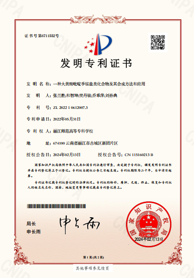 日前,我校张兰胜团队组织申报的发明专利“一种大黄酸吡啶季铵盐类化合物及其合成方法和应用”获得国家知识产权局颁发的发明专利授权证书(专利号:ZL 2022 1 0612007.3),该项专利是以我校作为专利授权单位获批的第一项发明专利。