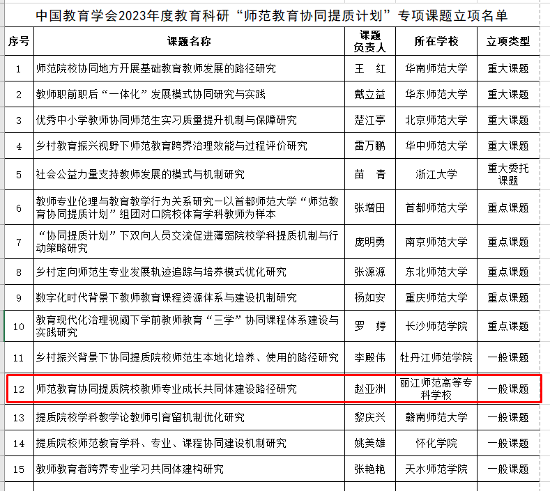 近日,中国教育学会2023年度教育科研“师范教育协同提质计划”专项课题立项公示。我校马克思主义学院赵亚洲老师主持申报的《师范教育协同提质院校教师专业成长共同体建设路径研究》课题获批立项公示。该项目课题组成员由“师范教育协同提质计划”第二组团院校丽江师范高等专科学校、云南师范大学和省内部分地州高校组成。