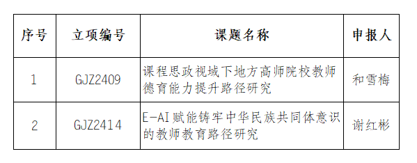 近日,收到云南省高校教师教育联盟 云南省教育科学规划领导小组办公室文件《关于公布2024年度云南省教育科学规划(高等学校教师教育联盟)教师教育专项课题立项课题名单的通知》,我校2个项目获得立项。