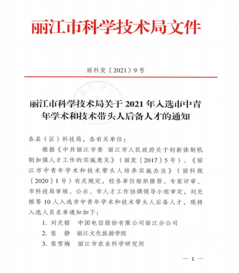 入选了丽江市中青年学术和技术带头人后备人才。据了解,本次后备人才项目经各单位组织推荐、专家评审、市科技局审核、公示、市人才工作协调领导小组审定,最终全市有
