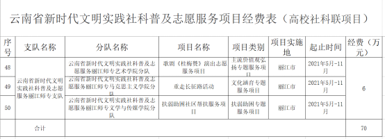 2021年4月云南省社会科学界联合会开始组织云南省新时代文明实践社科普及志愿服务行动项目申报工作,学校社科联积极组织申报,现经云南省社会科学界联合会公示,我校共获得3项云南省新时代文明实践社普及志愿服务行动项目获得工作经费支持,分别是艺术学院分队负责的歌剧《桂梅赞》演出志愿服务项目、马克思主义学院分队负责的重走长征路活动项目和文学与传媒学院分队负责的扶弱助困社区帮扶服务项目,共计获得工作经费6万元。