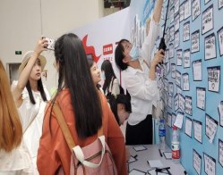展区丰富的内容吸引了很多同学参与互动与拍照留念,在“致敬逆行者”、“药丸口服液造型”展台,以及“发现,实现共存和谐”展区展示的儿童绘画作品面前,大家纷纷拍照,记录下这一独特瞬间。展区还设置了“我想对您说”的留言板块,同学们纷纷写下留言,表达对祖国的热爱和抗疫逆行者的尊敬。