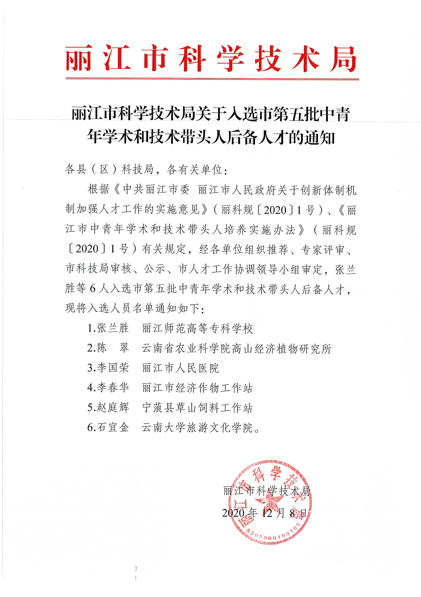 近日,丽江市科技局下发了《丽江市科学技术局关于入选第五批中青年学术和技术带头人后备人才的通知》,我校张兰胜副校长入选了丽江市第五批中青年学术和技术带头人后备人才。据了解,本次后备人才项目经各单位组织推荐、专家评审、市科技局审核、公示、市人才工作协调领导小组审定,最终全市有6人入选。