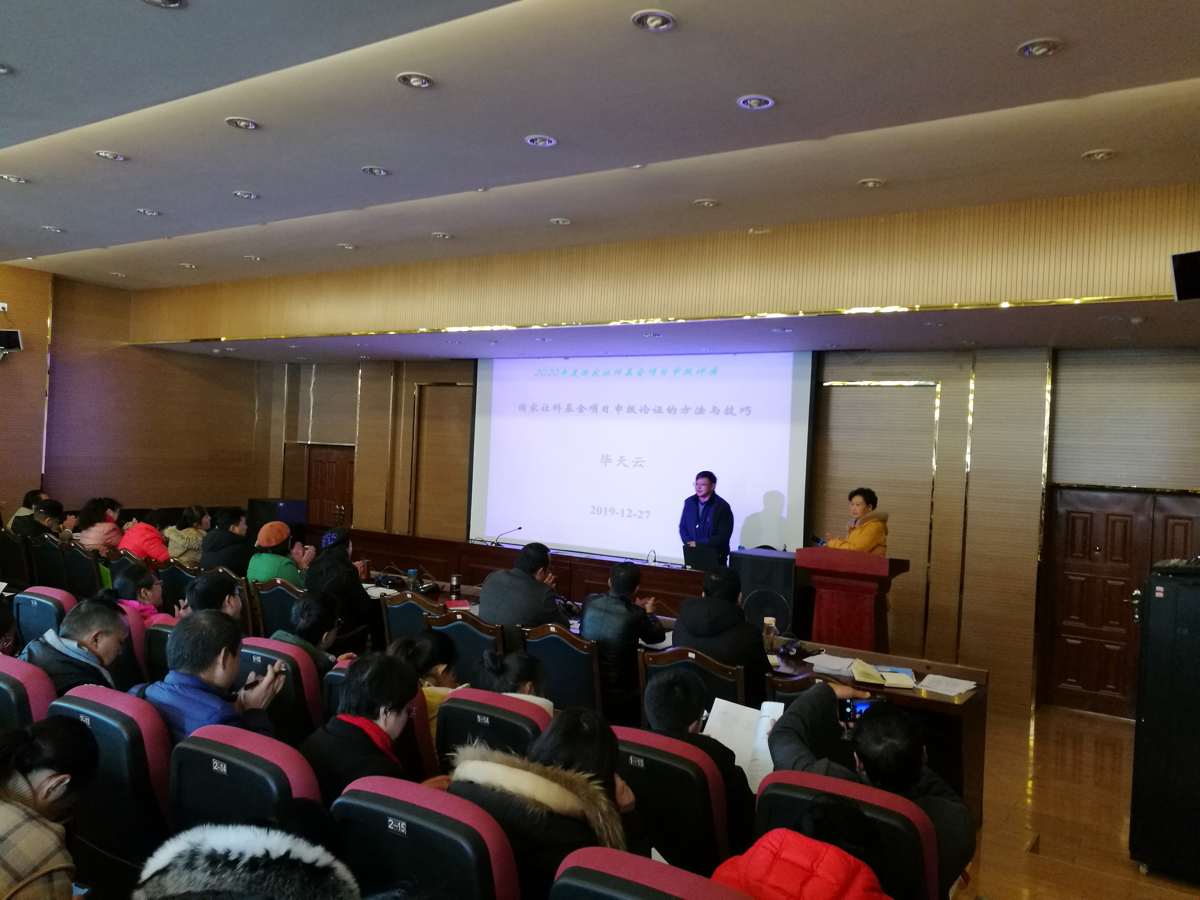 2019年12月27日下午14:30,为促进我校2020年度国家社科基金项目申报工作,我校校长、法学博士、二级教授、博士研究生导师毕天云,为全校教师做了主题为“国家社科基金项目申报论证的方法与技巧”的学术讲座,讲座由朱桂香副校长主持。