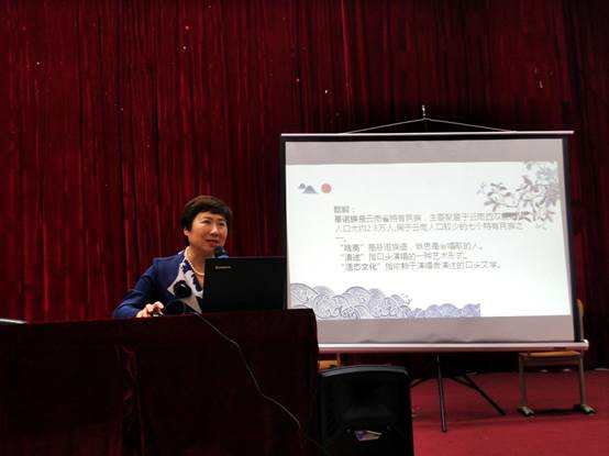 陈孟云教授首先向大家介绍了基诺族基本情况和演述、活态文化等概念,随后通过介绍2017年联合国教科文组织保护非物质文化遗产政府间委员会第十届常会NGO年度大会盛况,形象的解释了非遗与活态遗产的关系。接着通过大量生动的图像文字资料深入讲解了“口头演述的史诗成为活形态文化的演变进程”、“国内外史诗研究概况”、“中国史诗研究的学术转向”、“活态文化研究的内在理路”、“基诺族濒危史诗《普遮子》研究”问题况,向师生们展示了活态文化的魅力。最后她对“如何保护活形态文化”提出了几点思考,他说云南世居民族的口头演述与图像叙事原始资料非常丰富,但由于现代文明的冲击,两者都面临消亡走势,要,借鉴国内外的先进经验和做法,重视活态文化的保护和传承。