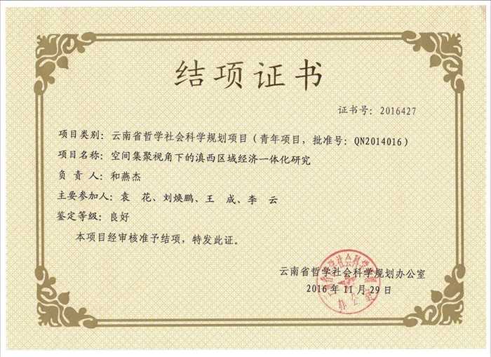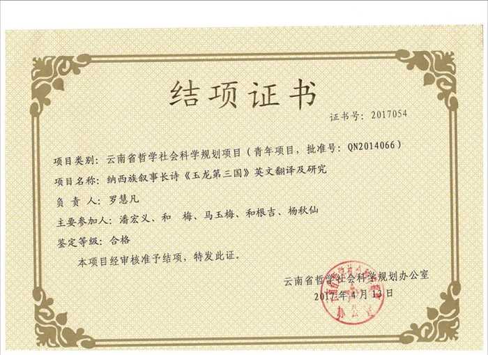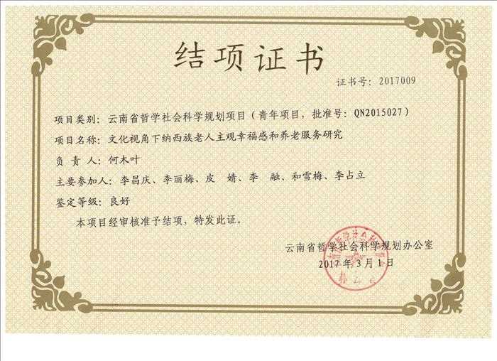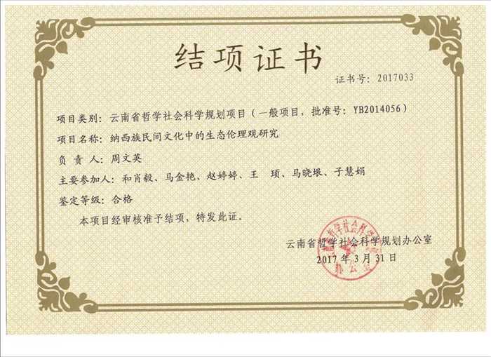 近日,我校共4项云南省哲学社会科学规划项目顺利通过结项验收,分别是:2014年度和燕杰副教授主持的《空间集聚视角下的滇西区域经济一体化研究》(青年项目,批准号:QN2014016),鉴定等级:良好;罗慧凡老师主持的《纳西族叙事长诗《玉龙第三国》英文翻译及研究》(青年项目,批准号QN2014066),鉴定等级:合格;周文英教授主持的《纳西族民间文化中的生态伦理观》(一般项目,批准号YB2014056),鉴定等级:合格; 2015年度何木叶老师主持的《文化视角下纳西族老人主观幸福感和养老服务研究》(青年项目,批准号QN2015027),鉴定等级:良好。