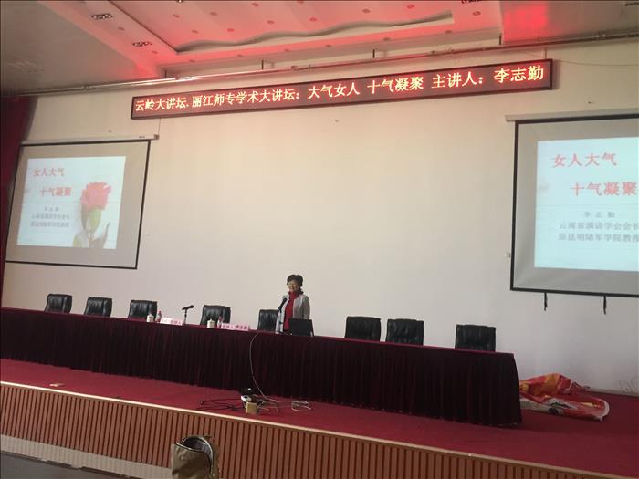 2018年5月11日上午10:00,原昆明陆军学院教授、云南省演讲学会会长李志勤到我校讲座,在图书馆报告厅作了题为“大气女人,十气凝聚”的学术讲座,全校300余名女教师和女学生参加讲座,讲座由科技处处长木春燕主持。